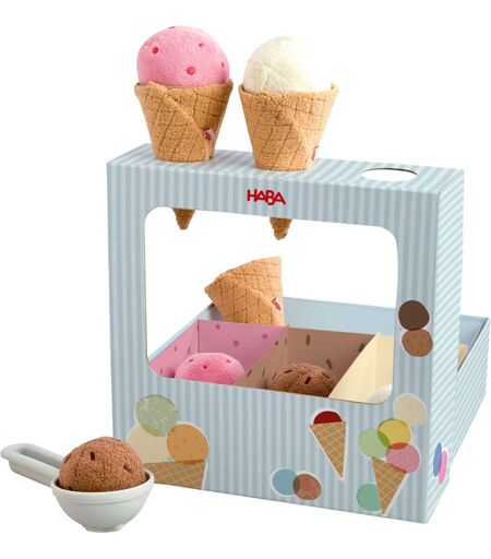 Das Eisdielen-Set von HABA bildet eine optimale Basis für kreative Rollenspiele. Es fördert die Feinmotorik und Sprachentwicklung Deines Minis und sorgt für jede Menge Spaß im Kinderzimmer. Eisdiele Creative Play von HABA 6 Eiskugeln, 3 Waffeln, Eisportionierer, Verpackung als Verkaufsstand verwendbar Eiskugeln mit Magneten aus Polyester, PP, Pappe, Metall ab 3 Jahren geeignet Mit dem Set Creative Play Eisdiele von HABA serviert Dein Mini leckeres und kleckerfreies Eis. Die Verpackung des Spielzeugs wird im Nu in einen Verkaufsstand umfunktioniert. Die drei Waffeln lassen sich mit den bunten Eiskugeln befüllen. Dabei darf ruhig gestapelt werden – Magnete halten die Stoffbälle an ihrem Platz. Ein Eisportionierer gestaltet das Spiel möglichst authentisch. ...