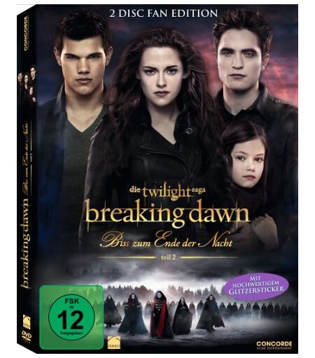 AspectRatio : 2.40 : 1, AudienceRating : Freigegeben ab 12 Jahren, Brand : STEWART, KRISTEN/PATTINSON, ROBERT, Binding : DVD, Label : Concorde Video, Publisher : Concorde Video, NumberOfDiscs : 2, RegionCode : 2, NumberOfItems : 2, Format : Dolby, medium : DVD, publicationDate : 2013-03-28, releaseDate : 2013-03-28, runningTime : 110 minutes, theatricalReleaseDate : 2012-01-01, writers : Stephenie Meyer, actors : Kristen Stewart, Robert Pattinson, Taylor Lautner, directors : Bill Condon, music : Carter Burwell ...
