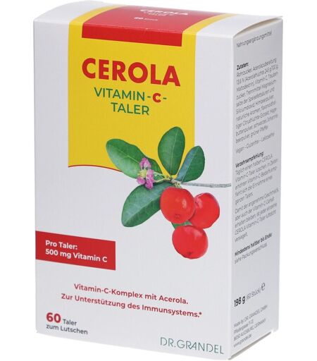 Nahrungsergänzungsmittel sind kein Ersatz für eine ausgewogene und abwechslungsreiche Ernährung und eine gesunde Lebensweise. Vitamin C Zutaten: Rohrzucker, Acerolazubereitung 13,6 % (Acerolafrüchte 245 g/100 g, Maltodextrin), Vitamin C, Traubenzucker, Trennmittel Magnesiumsalze der Speisefettsäuren und Siliciumdioxid, Himbeerpulver, natürliche Aromen, flavonoidhaltiger Citrusfrüchte-Extrakt, Hagebuttenpulver, schwarzes Johannisbeerpulver, grüner Pfeffer.Glutenfrei – milchzuckerfrei – hefefrei Zusammensetzung: Nährwerte pro 1/2 Taler % * pro1 /2 Talerpro Taler % *pro TalerVitamin C250 mg312%500 mg625%*Referenzmenge für die tägliche Zufuhr gemäß EU-Lebensmittel-informationsverordnungVerzehrsempfehlung:Täglich einen halben CEROLA Vitamin-C-Taler lutschen. In Zeiten erhöhten Vitamin-C-Bedarfs empfiehlt sich die Einnahme eines ganzen Talers. Hinweis:Die angegebene empfohlene Tagesmenge darf nicht überschritten werden.Aufbewahrung: Kühl (6-25 °C) und lichtgeschützt lagern. Außerhalb der Reichweite von kleinen Kindern aufbewahren.Nettofüllmenge (in mehreren Größen erhältlich):16 Taler = 53 g32 Taler = 106 g60 Taler = 198 g96 Taler = 318 gHersteller:Dr. Grandel86041 AugsburgPostfach 11 16 49 ...