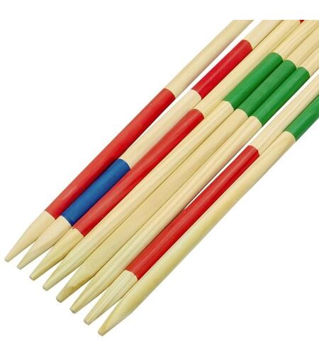 Mikado für den Garten oder das Kinderzimmer. Halten Sie alle Balken so, dass sie nach oben zeigen. Dann lassen Sie sie frei fallen, so dass sie sich auf dem Boden ausbreiten. Die Aufgabe besteht darin, nach und nach so viele Balken wie möglich zu erhalten, ohne sich zu berühren oder zu bewegen. Wer einen Mikada-Stock bekommt, kann damit einen anderen Stock anheben. Wenn sich jedoch ein anderer Schläger bewegt, darf der Spieler nicht weitermachen. Er muss den Stock verlassen, den er nur nehmen wollte. Die Punkte werden gemäß den in der Anleitung angegebenen Balkentypen hinzugefügt. Der Spieler, der am Ende die meisten Punkte sammelt, gewinnt. Das Produkt ist mit einer schwarzen Netztasche zur Lagerung und zum Transport ausgestattet. Stangengröße: 75 cm Inhalt: 26 Stück ...