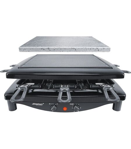 Der Steba RC 3 Plus Raclettegrill mit acht Pfännchen ist genau das Richtige für einen abend mit Freunden. Zum Zubereiten der verschiedensten Speisen stehen einem zwei Grillplatten zur Auswahl, eine wendbare, emaillierte Stahlguß-Grillplatte und eine kratzfeste Natursteingrillplatte. Die acht emaillierten Pfännchen sind schneid und kratzfest und dazu noch spülmaschinengeeignet. Die Grillfläche hat eine Länge von 26 cm und eine Breite von 26 cm. Auf der Vorderseite des RC 3 Plus befindet sich ein stufenloser Temperaturregler und ein Ein-/Ausschalter. ...