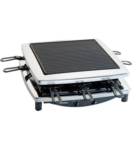 Der Steba RC 3 Plus Chrom Raclettegrill mit acht Pfännchen ist genau das Richtige für einen abend mit Freunden. Zum Zubereiten der verschiedensten Speisen stehen einem zwei Grillplatten zur Auswahl, eine wendbare, emaillierte Stahlguß-Grillplatte und eine kratzfeste Natursteingrillplatte. Die acht emaillierten Pfännchen sind schneid und kratzfest und dazu noch spülmaschinengeeignet. Die Grillfläche hat eine Länge von 26 cm und eine Breite von 26 cm. Auf der Vorderseite des RC 3 Plus Chrom befindet sich ein stufenloser Temperaturregler und ein Ein-/Ausschalter. ...