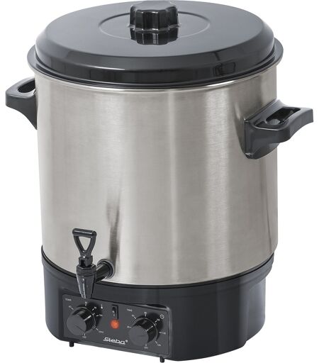 Mit dem Einkoch- und Glühweinautomat ER 2 von Steba kann man nicht nur Säfte, Früchte oder Marmelade auf komfortable Weise konservieren, sondern auch Kochen, Auftauen und Warmhalten. Mit dem integrierten Zapfhahn eignet sich der Einkochautomat besonders gut für die Zubereitung von Glühwein. Er hat ein Fassungsvermögen von 27 Litern. Mit dem Thermostat kann eine Temperatur von 30°C bis 100°C eingestellt werden. Ein Signalton gibt an, wann die gewünschte Temperatur erreicht ist. Der Einkochautomat ER 2 lässt sich auch perfekt als Heißgetränkespender verwenden. Egal ob Glühwein, Kaffee oder Tee - alle Getränke lassen sich darin warmhalten, und durch den integrierten Ablasshahn perfekt in Tassen oder Becher dosieren. Auch der Timer mit 120 Minuten oder Dauer-Ein-Funktion bietet einen hohen Bedienkomfort. Wird der Deckel bei laufendem Betrieb umgedreht, kann er auch als Tassenhalter / -Wärmer genutzt werden. ...