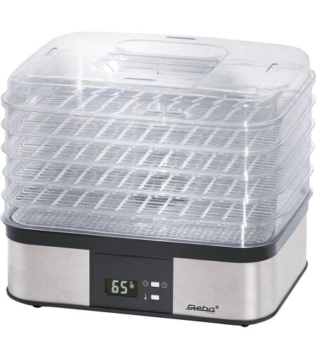 Der elektronische Dörrautomat ED 5 von Steba eignet sich zum Trocknen und Haltbarmachen von Obst, Gemüse, Pilzen, Kräutern, Kernen und Nüssen, Fleisch und Fisch. Vitamine, Mineralstoffe, wichtige Ballaststoffe und Eisen bleiben praktisch erhalten und Geschmacksaromen werden konzentriert. Die Bedienung ist einfach und durch das Display übersichtlich. Die gewünschte Temperatur kann in 5°C-Schritten von 40°C bis 70°C reguliert und der Timer kann von einer Stunde bis zu 36 Stunden eingestellt werden. Der langlebige Motor mit Lüfterflügeln ist mit einer Leistung von 350 Watt ausgestattet. Der ED 5 verfügt über fünf Roste sowie eine Kräuterablage. Je nach Menge des Dörrgutes kann das Gerät mit einem oder fünf Rosten betrieben werden. ...