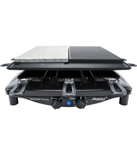 Das Raclette RC 4 Plus Deluxe hat ein Edelstahlgehäuse bietet Platz für acht Raclette-Pfännchen sowie zwei Grillplatten. Die Pfännchen sind emailliert, dadurch sind sie schneid- und kratzfest und können in der Spülmaschine gereinigt werden. Die Grillfläche beträgt insgesamt 29 cm x 29 cm und zum Zubereiten der verschiedensten Speisen stehen drei Grillplatten zur Auswahl, eine Antihaft-Druckguss-Grillplatte, eine Natursteingrillplatte und eine wendbare Gourmet-Guss-Pfanne mit glatter Fläche. An der Vorderseite des RC 4 Plus Deluxe befindet sich ein stufenloser Temperaturregler sowie ein Ein-/Ausschalter. Überschüssiges Fett und Bratenflüssigkeit läuft in eine dafür vorgesehene Auffangrille. ...