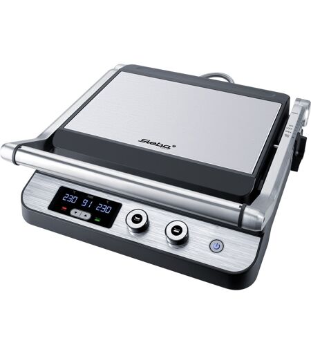 Der Steba Kontaktgrill FG 120 mit ansprechendem Edelstahlgehäuse ist vielseitig einsetzbar. Er eignet sich zum Kontaktgrillen, dank der verstellbaren Höhe auch zum Überbacken, und zum offen Grillen aufgeklappt auf doppelter Fläche. Die Temperaturen lassen sich für die obere und die untere Grillplatte individuell bis 230°C regeln. Die beiden großen antihaftbeschichteten Grillflächen messen 27 x 24cm, und bestehen aus einer glatten und einer geriffelten Grillfläche. Außerdem verfügt der Kontaktgrill FG 120 über ein LED-Display für Temperatur und Timer, und herausnehmbare Grillplatten zur leichten Reinigung. ...
