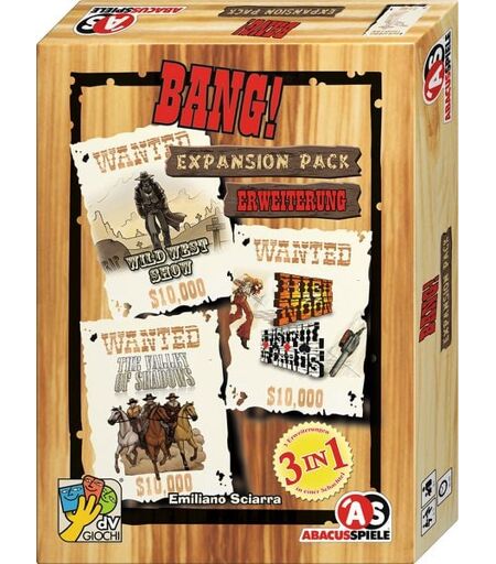 """BANG! ist die erfolgreichste Western-Kartenspiel-Serie mit weltweit über 1.000.000 verkauften Spielen. Für alle, die noch mehr spannende Duelle und rauchende Colts wollen, bringt das BANG! Expansion Pack drei Erweiterungen für erfahrene Revolverhelden ins Spiel: BANG! The Valley of Shadows: Nur die wagemutigsten Revolverhelden trauen sich in das ""Tal der Schatten"". Dort lauern nicht nur Klapperschlangen, Kopfgeldjäger und Tornados auf dich – auch die Geister deiner Gegner können dich heimsuchen. BANG! Wild West Show: Vorhang auf zur verrücktesten Show im Wilden Westen. Neue, mächtige Revolverhelden sind in der Stadt und bringen jede Menge Chaos mit sich. Unfaire Duelle und unvorhersehbare Ereignisse sorgen für ein turbulentes Spielvergnügen. BANG! High Noon und A Fistful of Cards: In der Hitze der Mittagssonne gehen die Duelle zwischen Sheriff und Banditen in die nächste Runde. Spannende Ereigniskarten sorgen für noch mehr Abwechslung im Western-Kultspiel. Inhalt: 16 Charakterkarten 16 Spielkarten 10 Wild-West-Show-Karten 13 High-Noon-Karten 15 A-Fistful-of-Cards-Karten 1 Spielregel Achtung: Diese Erweiterung ist kein eigenständiges Spiel. Sie kann nur zusammen mit dem Grundspiel BANG! gespielt werden! Das Spielsystem BANG!: BANG! ist ein schnelles und taktisches Kartenspiel, das im Wilden Westen spielt. In jeder Runde ziehen die Spieler Karten und schießen auf ihre Gegner, während sie ihre eigene Identität geheim halten. Der Sheriff versucht, mit seinen Hilfssheriffs gegen Outlaws und den Kopfgeldjäger zu bestehen. Mit den zahlreichen Erweiterungen wächst das Spiel und sorgt für endlosen Spielspaß, bei dem Deduktion, Strategie und Glück gleichermaßen gefordert sind. " ...
