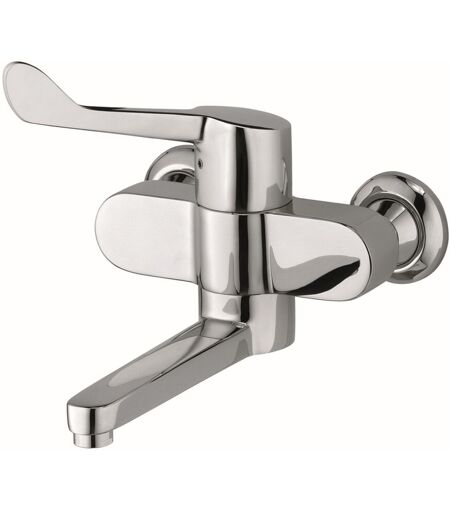 Klinik Wandarmatur, Hersteller Typ KLUDI GmbH & Co. KG KLUDI MEDI-CARE Wand-Einhandmischer Art. Nr. 349210524, DN 15, aus Messing verchromt, Sicherheits Keramik Kartusche mit einstellbarer Heißwasserbegrenzung D 35 mm, Durchfluss 8 l/min, Ausführung wie folgt: Wand-Einhandmischer DN 15, mit arretierbarem oder schwenkbarem Auslauf, mit Care Strahlregler M 24 x I (Laminarstrahl ohne Luftansaugung), Geräuschverhalten DIN 4109 Gruppe I, Prüfzeichen PA- IX 9574 / IZ, Ausladung Betätigungselement in mm 160, mit absperrbaren S Anschlüssen G 1/2 x G 3/4, Rosettendurchmesser D 70 mm, Ausladung Auslauf in mm 250, h ges. in mm 209, mit Klinik Armhebel, für geschlossene Trinkwassererwärmer, für Durchflusswassererwärmer bedingt geeignet, PN 10 ...