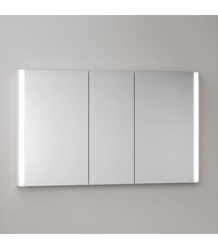 KEUCO Royal Atlas LED Spiegelschrank 120 x 71 x 11,5 cm mit 3 Türen, Unterputz, 211201450110 Eigenschaften: Wandeinbau-Montage 3 Drehtüren aus Kristall-Doppelspiegel mit Anschlagsdämpfung griffloses Design (Griffe auf Wunsch separat bestellbar) Korpus: Aluminium Korpusseite: Spiegel Korpusrückwand: HDF (weiß) 2 innenliegende Steckdosen (Typ F) 2x 3 höhenverstellbare Glasablagen (zusätzliche Ablagen separat bestellbar) erstklassige Qualität und Verarbeitung Made in Germany Bedienung: Bedienfeld mit kapazitiver Touch-Sensorik Ein-/Ausschalten über wahlweise über Bedienfeld oder Raumschalter möglich Beleuchtung: vertikale Beleuchtung Innenraumbeleuchtung Helligkeit: stufenlos dimmbar Lichtfarbe: 3000 Kelvin (warmweiß) Leuchtmittel: LED (Lebensdauer > 30.000 Stunden) Technische Daten: Leistungsaufnahme LEDs: 25 Watt Schutzart: ausstehend Anschluss: 220-240 V, 50/60 Hz Tiefe vor der Wand: 6 cm Abmessungen (BxHxT): 120 x 71 x 11,5 cm Hinweise: 3 Jahre Garantie (zusätzlich zur gesetzlichen Gewährleistung von 2 Jahren) 10 Jahre Ersatzteilversorgung Austausch der LED-Streifen mit Steckverbindungen durch Fachhandwerker kein Einbaurahmen nötig Wandausschnitt: B: 118,8-119,6 H: 69,6-70 T: min. 6,8 cm Lieferumfang: Spiegelschrank, Befestigung, Inneneinteilung, Leuchtmittel weitere Details: Breite:120cm Höhe:71cm Tiefe:11,5cm Farbtemperatur:3000K Lichtstrom:3240 Lumen Designer:Dominik Tesseraux Fassung:LED Leistung Leuchtmittel:27 Material Korpus:Aluminium Besonderheiten:mit Steckdose Eingebaute LED:Ja Leuchtmittel inklusive:Ja Lichtfarbe:warmweiß Lichtsteuerung:für Raumschaltung mit Ein-/Ausschalter mit Touchdimmer Ländervariante:Standard (Deutsche Norm) Montage:Unterputz Schalterposition:unten Steckdosenanzahl:2 Türanzahl:3 Zusatzbeleuchtung:mit Innenbeleuchtung Gewicht:40kg ...