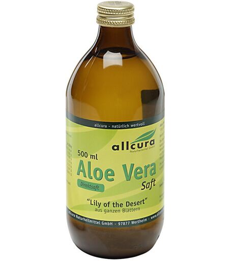 Bitte achten Sie auf eine abwechslungsreiche und ausgewogene Ernährung und gesunde Lebensweise.Aloe Vera Saft "Lily of the Desert"Bereits in der Antike war die Aloe wohlbekannt. Die Aloe Vera Pflanze erinnert in ihrem Aussehen an einen Kaktus, gehört aber zur Familie der Liliengewächse. Mittelamerika bietet ideale klimatische Voraussetzungen und Bodenbeschaffenheit für das Wachstum der Aloe Vera Pflanzen. Die sorgfältige und schonende Verarbeitung der Blätter schützt die natürlichen Inhaltsstoffe.Zutaten: 100% Direktsaft aus ganzen Blättern von Aloe barbadensis Miller. Nährwertangaben pro 100 g Brennwert 10 kJ / 3 kcal Fett 0,03 g davon gesättigte Fettsäuren 0,00 g Kohlenhydrate 0,13 g davon Zucker 0,13 g Eiweiß 0,07 g Salz 0,011 g Verzehrsempfehlung: 2 x 2 Esslöffel pro Tag.Hinweis: Die angegebene empfohlene Tagesmenge darf nicht überschritten werden. Aufbewahrung: Nach Anbruch im Kühlschrank aufbewahren und innerhalb von zwei Wochen aufbrauchen.Nettofüllmenge: 500 mlHerstellerdaten: allcura Naturheilmittel GmbH 97877 Wertheim ...