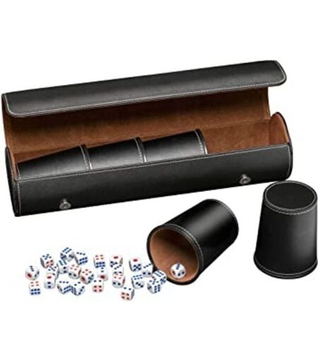 Hülle: Kunstleder, schwarz, Magnetverschluss, Maße 343 x 90 x 90 mm. Würfelbecher: Kunstleder, schwarz, 5 Stück, Maße 90 x 75 x 60 mm. Würfel: Kunststoff, 25 Stück, 13 mm ...