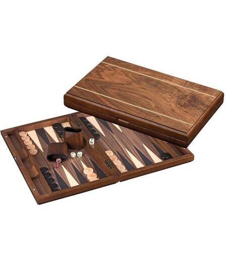 Kassette, MDF, Hevea Holz, Walnuss Furnier, braun gebeizt, Intarsien, Magnetverschluss, Steinablage, mit Spielsteinen, Würfeln, Würfelbechern und Stoffbeutel für Spielsteine. Maße Spiel offen: 490 x 600 x 32 mm. ...