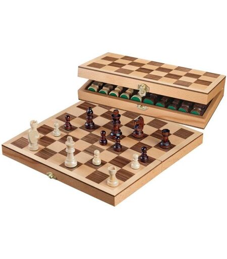 Kassette: MDF, Buche Furnier, Walnuss Furnier, Buche, Intarsien, Figureneinlage, Feld 33 mm. Figuren: Design Staunton, Schima Holz, natur und braun gebeizt, Filzsockel, König 64 mm. Maße Spiel offen: 300 x 300 x 27 mm. ...