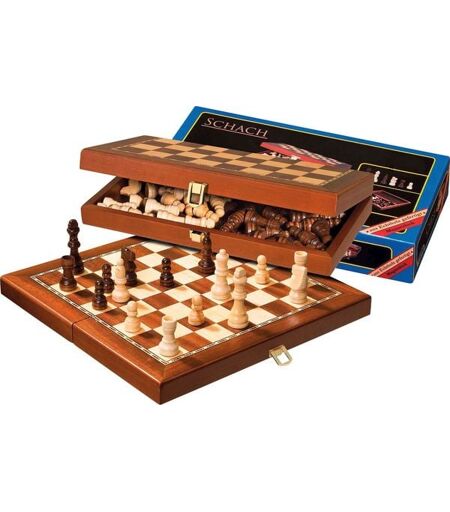 Kassette: MDF, Ahorn Furnier, Pappel, Sapellioptik, braun gebeizt, Intarsien, dreifache Zierader, magnetisch, Feld 30 mm. Figuren: Design Staunton, Schima Holz, natur und braun gebeizt, gewichtet, Filzsockel, König 65 mm. Mit Stoffbeutel für Schachfiguren. Maße Spiel offen: 295 x 290 x 25 mm. ...