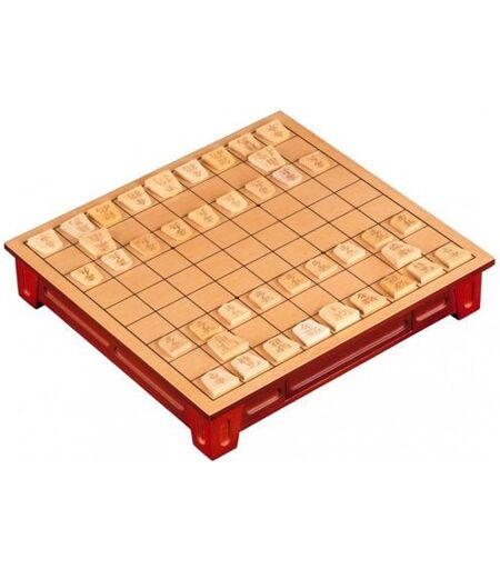 Shogi Tisch: Kiefer, braun und rotbraun gebeizt, Spielfeld bedruckt, zwei Schubfächer, Maße 270 x 250 x 50 mm. Spielsteine: Buche, 40 Stück. ...