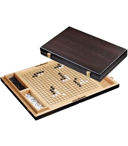 Kassette: Linde, MDF, Walnuss Furnier, braun gebeizt, klappbar, Maße Spiel offen: 365 x 460 x 25 mm, Feld 14 x 15 mm. Spielsteine: Kunststoff, schwarz und weiß, ca. 360 Stück, Durchmesser 13 mm. ...