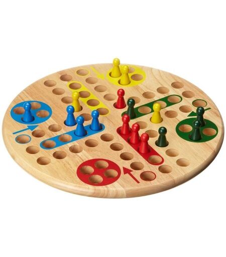 Spielbrett: Hevea Holz, Durchmesser 380 mm. Spielkegel: Birke, 16 Stück, rot, grün, blau, gelb, Durchmesser 20 mm, Höhe 50mm. Würfel: Birke, 2 Stück, 25 mm. ...