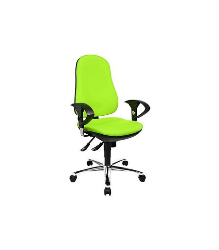 Hier nehmen Sie gerne Platz – der Topstar Bürostuhl Support ®Syncro Deluxe, 8559U G05 Stoff grün, Gestell chromAlle relevanten Informationen zum Topstar Bürostuhl Support ®Syncro Deluxe, 8559U G05 Stoff grün, Gestell chrom erhalten Sie hier!Trifft der Topstar Bürostuhl Support ®Syncro Deluxe, 8559U G05 Stoff grün, Gestell chrom Ihren Geschmack?Der Topstar Bürostuhl Support ®Syncro Deluxe, 8559U G05 Stoff grün, Gestell chrom ist nicht nur funktionell, sondern auch optisch ein Volltreffer. Alle Details:Farbe: ApfelgrünFarbe Gestell: ChromMaterial: 100% PolypropylenMaterial Fußkreuz: StahlDer Bezug hat außerdem eine hohe Scheuerfestigkeit von 40.000 Scheuertouren, d.h. Sie werden lange Freude daran haben. Damit alles passtDas Gewicht des Modells liegt bei 17,5 kg und der Durchmesser des Fußkreuzes beträgt 64,0 cm. Werfen Sie außerdem einen Blick auf folgende Werte:Sitzhöhe: 42,0 - 55,0 cmSitzbreite: 45,0 cmSitztiefe: 43,0 cmNutzergröße: bis 192,0 cmHöhe der Rückenlehne: 57,0 - 65,0 cmBelastbarkeit: bis zu 110,0 kgDamit Sie mit Ihrer neuen Sitzgelegenheit zufrieden sind, sollten diese Werte mit Ihren Anforderungen übereinstimmen. Passen Sie? Dann ist die Nutzung ohne Weiteres möglich.Sitzform und empfohlene SitzzeitDer Bandscheibensitz stützt Ihre Bandscheiben und das Becken. Hierfür steigt die Sitzfläche nach hinten stark an. Damit außerdem die gesamte Sitzfläche genutzt werden kann und Sie nicht nach vorne rutschen, steigt der vordere Teil leicht an. Der Topstar Bürostuhl Support ®Syncro Deluxe, 8559U G05 Stoff grün, Gestell chrom hat eine empfohlene Sitzzeit von bis zu 8 Stunden.Alles zur Sitzmechanik und ihren VorteilenDie Synchron-Mechanik sorgt dafür, dass sich Rückenlehne und Sitzfläche in einem synchronen Bewegungsablauf zueinander verhalten. Die Sitzmöglichkeit passt sich also Ihrer Körperhaltung und Ihren Bewegungen an.Entlastung für Rücken und ArmeDie Rückenlehne besteht aus angenehmem Polstermaterial. Die Lendenwirbelstütze unterstützt den unteren Bereich des Rückens und hilft dabei, eine gesunde Sitzposition einzunehmen. Dank der verstellbaren Neigung und Höhe der Rückenlehne können Sie immer eine bequeme Position einnehmen. Entlasten Sie Ihre Arme zusätzlich auf den Armlehnen und beugen Sie gleichzeitig auch Verspannungen im Nacken und Schulterbereich vor. Für eine individuelle Anpassung lassen sich die Armlehnen in der Höhe verstellen. Ihre Räumlichkeiten sind mit einem Teppichboden ausgestattet? Optimal, denn hierfür sind die Doppelrollen perfekt geeignet.Die Stühle von Topstar sind besonders rückenfreundlichBei Topstar werden Bürostühle für Büroräume oder auch für zuhause hergestellt. Die Stühle sind besonders kreiert für Menschen, die immer am Schreibtisch sitzen. Das dreidimensionale, bewegliche Sitness-System ist besonders rückenfreundlich.Trifft, wonach Sie suchen?Beim Kauf erhalten Sie vom Hersteller 3 Jahre Garantie und profitieren hierdurch von einem zusätzlichen Schutz. Bestellen Sie den Topstar Bürostuhl Support ®Syncro... ...