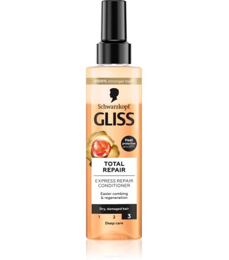 Schwarzkopf Gliss Total Repair, 200 ml, Leave-in Conditioner für Damen, Der Leave-in-Conditioner Schwarzkopf Gliss Total Repair bietet eine sofortige Dosis an intensiver Feuchtigkeit und Nährstoffen. Das Produkt versorgt das Haar mit allem, was es direkt nach der Haarwäsche benötigt, ohne dass Sie im Bad unnötig viel Zeit verbringen müssen. Das Haar wird geschmeidig und erhält seinen natürlichen Glanz und die Integrität seiner Struktur zurück. Die Formel unterstützt die Regeneration und trägt dazu bei, dass sich das Haar leichter kämmen lässt. Und das alles einfach, schnell und ohne die Notwendigkeit, das Produkt auszuspülen. Einfach auftragen, einarbeiten, bzw. durchkämmen und schon wird das Haar von innen und außen wieder vor Kraft strotzen. Probieren Sie diesen Leave-in-Conditioner und entdecken Sie eine einfache und schnelle Möglichkeit der Haar-Regeneration mit vielen weiteren Vorteilen. Eigenschaften: regeneriert das Haar stärkt die Haarfasern pflegt die Längen geschwächten Haars erleichtert das Kämmen und das anschließende Stylen des Haars Anwendung: Sprühen Sie eine angemessene Menge des Produkts auf das handtuchtrockene Haar und massieren Sie es mit den Händen ein. Nicht ausspülen und weiter wie gewohnt vorgehen. ...