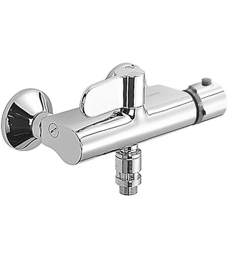Hansa Brause-Thermostat-Batterie für Wandaufbau Hansatempra Rohrunterbrecher A2 0824 chrom Allgemeine Attribute: Produktgruppe: Duscharmatur Einbauart: Wandmontage Technisches Merkmal: Thermostat Oberfläche: Chrom Produkt Eigenschaften: Verbindung: S-Anschlüsse, mitintegrierter Vorabsperrung Hebel/Bediengrifftyp:Temperatureinstellgriff,Durchflusseinstellgriff Temperatureinstellungen:Temperaturbegrenzer, Heißwassersperreeinstellbar (im Lieferumfangenthalten), Sicherheitssperre gegenVerbrühen bei 38C Mechanische Teile:Thermostatkartusche zurTemperaturreglung,Rückflussverhinderer, mitSicherungseinrichtung, Schmutzfilter Spezielle Eigenschaften:Armaturenkörper ausentzinkungsbeständigem Messing (DZR),Wasserwege ohne Nickelbeschichtung,Thermische Desinfektion nach DVGW W551ohne erneute Regelteil Einjustierungmöglich Fliesseigenschaften: Durchfluss bei 300 kPa: 21,00 l/min Bestimmungen/Vorschriften: EN Standard: EN 1111 Geräuschklasse: I (ISO 3822)ZULASSUNGEN: ABP: PA-IX 29304/ID Technische Eigenschaften: DN-Größe: DN15 Material: Messing Heißwasserversorgung: max. +80C Arbeitsdruck: 100 1000 kPa Anschlussgröße: G1/2 Installationsabstand: cc150 + 20 mm Sicherungseinrichtung (EN1717): DB Logistik: Bruttogewicht: 4.219 kg Verpackungsmaße: 430 x 215 x 191 ...