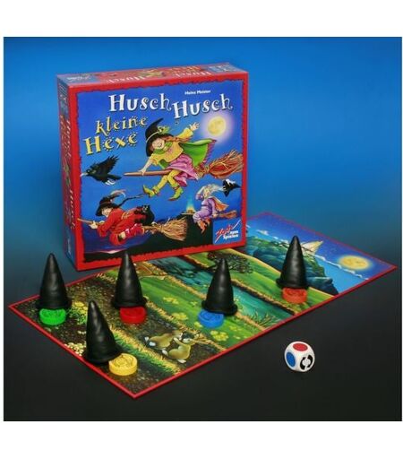 Husch Husch kleine Hexe Kinderspiel, Husch, husch, kleine Hexe! Schwing Dich auf deinen Besen und flieg los! In einer Stunde ist Walpurgisnacht. Da feiern alle Hexen auf dem Blocksberg ein Freudenfest. Aber sieh dich vor und zieh deinen Hexenhut tief über beide Ohren! Lass Dich nicht erwischen, denn junge Hexen dürfen sich nicht blicken lassen, wenn die Alten um das große Feuer tanzen. Zeig Dich auf deinem Flug aber ab und zu den jungen Hexenmeistern, damit sie dich schnell zum Blocksberg führen können. Und jetzt husch, husch, kleine Hexe … Für 2-5 Spieler im Alter ab 3 Jahren. Material: 1 Spielplan, 5 große Hexenhüte, 5 Hexenscheiben in 5 Farben, 1 großer Farbwürfel, 1 Spielregel ...