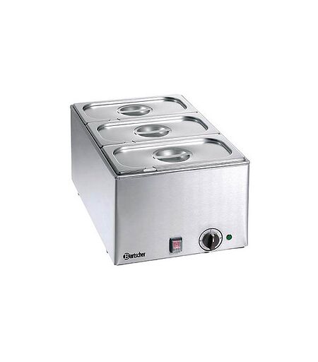 Bartscher 313-150 GN 1/1 Bain Marie: ideal für kreative KüchenanwendungenDie Bartscher 313-150 GN 1/1 Bain Marie schafft eine einladende Atmosphäre bei Buffets, da sie die Speisen ansprechend präsentiert und gleichzeitig warm hält. Gäste können jederzeit auf frisch zubereitete Speisen zugreifen.Was das Modell zu bieten hatFolgende Eigenschaft macht das Modell zu einem besonders praktischen Utensil: Warmhaltefunktion. Die Warmhaltefunktion ermöglicht auch einen späteren Verzehr und gewährleistet, dass das Zubereitete warm und schmackhaft bleibt.Welche Leistung steht Ihnen zur Verfügung?Mit 1200 W hat das Exemplar ordentlich Power.Besonderheiten, die den Unterschied machenUnd das macht das Modell besonders: Anschlusswert: 1,2 kW, Spannung 230 V, Frequenz: 50/60 Hz, Geräte-Anschluss: steckerfertig, Tischgerät, kein Wasseranschluss, Wasserablaufhahn, Beckengröße 1x GN 1/1, Maße Becken (BxTxH): 30,5 x 51,0 x 15,5 cm, Gewicht: 10,6 kg.Woraus besteht das Modell?Reinigen oder mal schnell abwischen klappt bei diesem Exemplar sehr unkompliziert, denn es ist aus hochwertigem Edelstahl gefertigt und dadurch sehr strapazierfähig und stabil. Darüber hinaus verleiht ihm das Material eine elegante Optik. Beachten Sie diese Maße, damit Sie wissen, ob das Modell die passende Größe für Sie hat: Tiefe: 54,0 cmHöhe: 24,8 cmBreite: 33,8 cmSie möchten sich den Alltag erleichtern?Beim Kauf der Bartscher 313-150 GN 1/1 Bain Marie erhalten Sie Ihre Lieferung inklusive 3 GN-Behälter (1/3 GN), 3 Deckel mit Löffelaussparung. ...