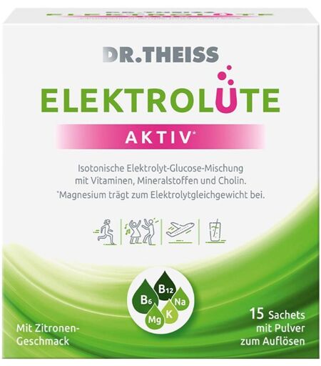 Anwendungsgebiet von Dr. Theiss Elektrolüte Aktiv Pulver SachetsDr. Theiss Elektrolüte Aktiv Pulver Sachets sind ein Nahrungsergänzungsmittel mit Glucose, Vitaminen, Mineralstoffen und Cholin.Wirkstoffe / Inhaltsstoffe / ZutatenZutaten von Dr. Theiss Elektrolüte Aktiv Pulver Sachets: