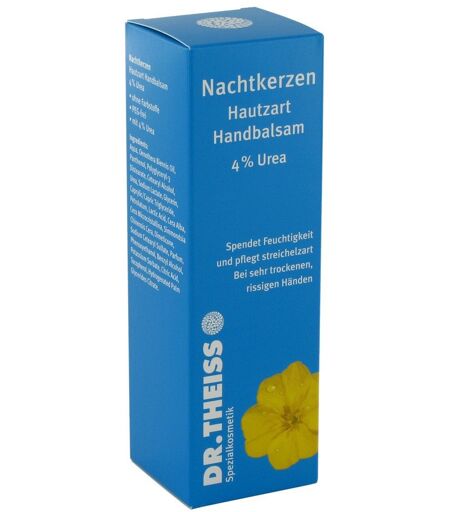 Der Zusatz von Urea, einer natürlichen feuchtigkeitsbindenden Substanz, versorgt die Haut intensiv mit Feuchtigkeit. Dadurch wird der Juckreiz reduziert und die Hände fühlen sich wieder weich an.Wirkstoffe / Inhaltsstoffe / ZutatenDr.theiss Nachtkerzen Hautzart Handbalsam enthält: Nachtkerzenöl, Urea, PanthenolGegenanzeigenBei bekannter Überempfindlichkeit gegenüber einem der oben genannten Inhaltsstoffe sollte dieses Produkt nicht angewendet werden.DosierungAnwendungshinweis und -Empfehlung von Dr.theiss Nachtkerzen Hautzart Handbalsam: