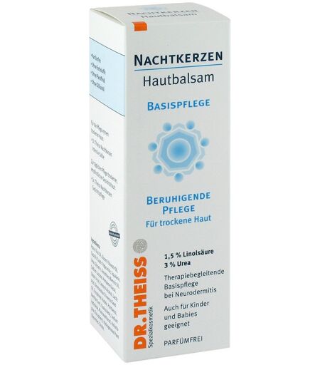Anwendungsgebiet von Dr.theiss Nachtkerzen HautbalsamDr.theiss Nachtkerzen Hautbalsam pflegt intensiv trockene Haut.Wirkungsweise von Dr.theiss Nachtkerzen HautbalsamTrockene Haut kann schuppig sein und schmerzhaft werden. Dr.theiss Nachtkerzen Hautbalsam gibt der Haut die fehlende Feuchtigkeit zurück und verhindert so ein erneutes Austrocknen. Dazu enthält Dr.theiss Nachtkerzen Hautbalsam Nachtkerzenöl, Urea, Squalen und Jojobaöl. Durch Vitamin E schützt Dr.theiss Nachtkerzen Hautbalsam ebenfalls vor oxidativen Schäden. Ihre Haut wird geschmeidig und zugleich werden die natürlichen Abwehrkräfte gestärkt. So kann sich die Haut besser selbst regenerieren. Durch den Verzicht auf Farbstoffe und Parfum ist Dr.theiss Nachtkerzen Hautbalsam besonders gut verträglich.Wirkstoffe / Inhaltsstoffe / ZutatenInhaltsstoffe von Dr.theiss Nachtkerzen Hautbalsam: