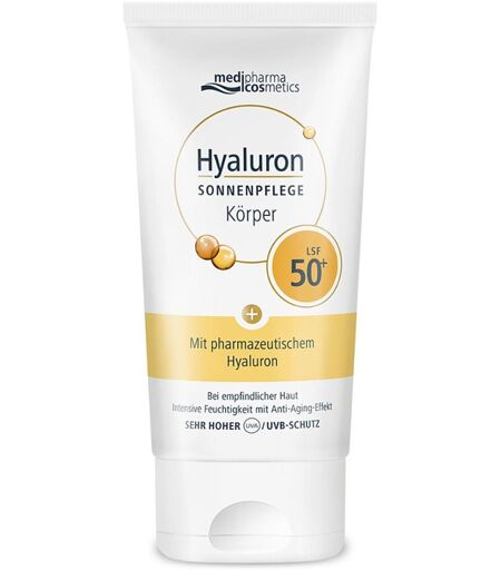 Anwendungsgebiet von Hyaluron Sonnenpflege Körper Lsf 50+Hyaluron Sonnenpflege Körper Lsf 50+ schützt und wirkt vorzeitiger Hautalterung entgegen. Hyaluron Sonnenpflege Körper Lsf 50+: spendet intensive Feuchtigkeit, zieht schnell ein und fettet nicht. Hyaluron Sonnenpflege Körper Lsf 50+ ist wasserfest.