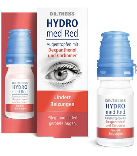 Anwendungsgebiet von DR. THEISS Hydro med Red AugentropfenAugenreizungen oder gerötete, trockene Augen können häufig durch äußere Reize, Reibungen durch Kontaktlinsen oder sonstige unangenehme strapazierende Effekte am Auge entstehen, wie zum Beispiel Bildschirmarbeit oder Heizungsluft. Die DR. THEISS Hydro med Red Augentropfen enthalten Dexpanthenol und Carbomer und können solche Reizungen am Auge lindern. Sie befeuchten und pflegen trockene, gerötete Augen.Das enthaltene Dexpanthenol unterstützt die feuchtigkeitsspendende Wirkung der körpereigenen Hyaluronsäure im Auge. Der Wirkstoff unterstützt die Heilung kleiner Wunden und kann so bei der Regeneration des gereizten Auges helfen.Carbomer setzt Feuchtigkeit frei und bildet auf dem Auge einen Gleit- und Schutzfilm. Somit wird ein Ausgleich für fehlende Tränenflüssigkeit geschaffen, um so Reizungen und Rötungen im Auge zu lindern.Eigenschaften: Lindert Reizungen im AugeBei geröteten, trockenen AugenZur verbesserten Befeuchtung und Pflege gereizter AugenMit Dexpanthenol und CarbomerOhne Phosphatpuffer10 ml, ca. 285 Tropfen (= ca. 1 Monatspackung)Mit Kontaktlinsen verträglichWirkungsweise von DR. THEISS Hydro med Red AugentropfenDexpanthenol unterstützt die feuchtigkeitsspendende Wirkung der körpereigenen Hyaluronsäure im Auge.