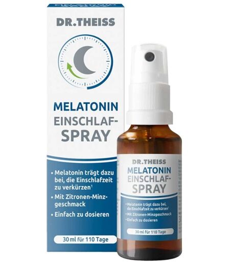 Anwendungsgebiet von Dr.Theiss EinschlafsprayDr. Theiss Melatonin Einschlaf-Spray ist ein Nahrungsergänzungsmittel mit Melatonin und Passionsblumenextrakt, mit Süßungsmitteln.
