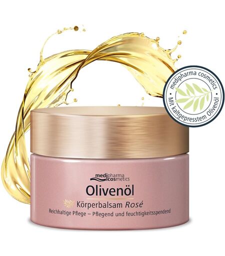 Anwendungsgebiet von Olivenöl Körperbalsam RoséOlivenöl Körperbalsam Rosé – Pflege & Duft für anspruchsvolle HautDer Olivenöl Körperbalsam Rosé kombiniert intensive Pflege mit einem zarten Rosenduft – ideal für trockene und empfindliche Haut. Die reichhaltige Formel mit kaltgepresstem Olivenöl, Sheabutter und Jojobaöl spendet tiefenwirksame Feuchtigkeit, glättet die Haut und macht sie spürbar weich.Feine Schimmerpartikel verleihen einen dezenten Glow, während die leichte Textur schnell einzieht und ein seidiges Hautgefühl hinterlässt – ganz ohne zu fetten. Spannungsgefühle werden gemildert, die Haut fühlt sich gepflegt, entspannt und geschmeidig an.Der sanfte Rosenduft macht das Eincremen zu einem kleinen Wohlfühlmoment – für gepflegte Haut und entspannende Pflege in einem.Vertrauen Sie auf die Olivenöl-Pflegeserie von medipharma cosmetics: dermatologisch getestet, hautfreundlich und auf natürliche Wirksamkeit ausgelegt.Wirkstoffe / Inhaltsstoffe / ZutatenOlivenöl Körperbalsam Rosé enthält: