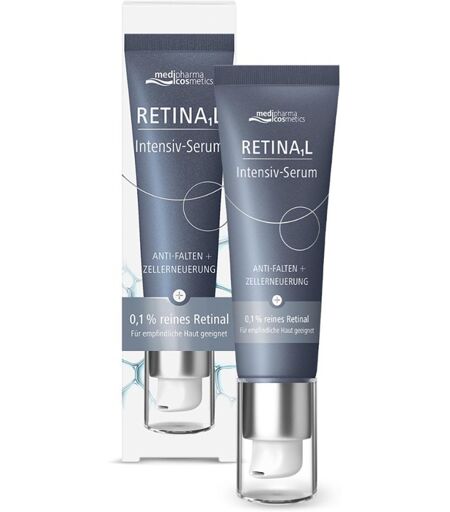 Anwendungsgebiet von Medipharma Cosmetics Retinal Intensiv-SerumDas hochwirksame Medipharma Cosmetics Retinal Intensiv-Serum reduziert sichtbar Falten und strafft die Haut für ein glatteres, jugendlicheres Hautbild. Dank der gezielten Förderung der Zellerneuerung sowie der Regulierung von Pigment- und Altersflecken verbessert es die Hautstruktur nachhaltig und sorgt für ein ebenmäßigeres Hautbild. Die fortschrittliche Formulierung mit 0,1 % reinem Retinal eignet sich ideal zur Faltenreduktion und bietet eine effektive Lösung bei Anzeichen der Hautalterung. Ihre Haut wirkt glatter, frischer und sichtbar jünger.Wirkstoffe / Inhaltsstoffe / ZutatenMedipharma Cosmetics Retinal Intensiv-Serum enthält:Aqua, Dimethicone, Propylheptyl Caprylate, Glycerin, Methylpropanediol, Prunus Amygdalus Dulcis Oil, Ethylhexyl Stearate, Retinal, Sodium Hyaluronate Crosspolymer, Sodium Hyaluronate, Panthenol, Tocopheryl Acetate, Caprylyl Glycol, Helianthus Annuus Seed Oil, Dimethiconol, Tocopherol, Phenylpropanol, Carbomer, Cellulose, Polyglyceryl-4 Diisostearate/Polyhydroxystearate/Sebacate, Sodium Isostearate, Parfum, Sodium Hydroxide, Citric Acid, Tetramethyl Acetyloctahydronaphthalenes, Linalyl Acetate und Amyl Salicylate.GegenanzeigenBei bekannter Überempfindlichkeit gegenüber einem der oben genannten Inhaltsstoffe sollte das Produkt nicht angewendet werden.DosierungAnwendungsempfehlung von Medipharma Cosmetics Retinal Intensiv-Serum:Serum abends auftragen. Wenn Sie bisher keine Produkte mit Retinal angewendet haben, empfehlen wir eine schrittweise Eingewöhnung aufgrund der intensiven Pflegewirkung von Retinal. Wenden Sie das Produkt zunächst 1–2 Mal wöchentlich über einen Zeitraum von ca. 2 Wochen an und steigern Sie sich dann bis zur täglichen Anwendung. Nicht häufiger als 1 x täglich anwenden. Tragen Sie am nächsten Morgen eine Tagespflege mit LSF auf. Tipp: das PROTECT Gesichtsfluid LSF 50+ empfiehlt sich als ideale Ergänzung. Enthält Vitamin A. Berücksic ...