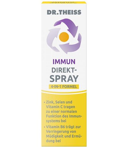 Das Besondere an Dr.Theiss Immun Direkt-Spray Das Immun Direkt-Spray kombiniert Zink, Selen und Vitamin C mit Vitamin B6. Zink, Selen und Vitamin C tragen zu einer normalen Funktion des Immunsystems (körperliche Abwehr) bei. Vitamin B6 trägt zu einer