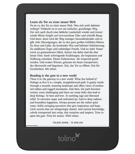 - Blendfreies, gestochen scharfes Display: kontrastreiches und hochauflösendes E Ink Schwarz-Weiß-Display. - NEU: Hörbuch-Wiedergabe: Bei Thalia / über den tolino gekaufte oder im Hörbuch-Abo erworbene Hörbücher via Bluetooth-Kopfhörer oder -Lautsprecher genießen. - Lesen bei allen Lichtverhältnissen: mit smartLight Beleuchtung anpassen. - 16 GB interner Speicher: Platz für bis zu 12.000 eBooks oder 75 Hörbücher 1 . - Wasserschutz²: sorgenfreies Lesen in der Badewanne oder am Pool. - Wochenlange Akkulaufzeit³: stundenlanges Lesen ohne häufiges Aufladen. Entspannte Lesestunden dank augenschonendem Display Der tolino shine überzeugt mit einem 6 Zoll Bildschirm, der für angenehmes und entspanntes Lesen sorgt. Mit hochauflösendem Schwarz-Weiß-Touchscreen und E-Ink-Carta Technologie fühlt sich das Lesen fast wie auf einer gedruckten Buchseite an. Stundenlanges Lesevergnügen, ohne Augenermüdung, und der blendfreie Bildschirm ermöglicht sogar das Lesen im Freien bei hellem Sonnenlicht. Entdecken Sie das tolino shine Display und überzeugen Sie sich selbst, wie digitales Lesen zu einem wahren Genuss wird. Ohren auf: Jetzt mit Hörbuchwiedergabe via Bluetooth Jetzt können Sie Ihre Wunschtitel nicht nur lesen, sondern auch hören – genießen Sie Hörbücher via Bluetooth über Kopfhörer oder Lautsprecher. Perfekt für alle Alltagssituationen, in denen Sie keine Hände freihaben, bietet der tolino shine ein flexibles und bequemes Hörerlebnis. Ihr idealer Begleiter im praktischen und kompakten Format Mit nur 173 g Gewicht und Abmessungen von 16 × 11,2 × 0,9 cm passt dieser handliche eReader mühelos in jede Tasche. Genießen Sie die einfache und komfortable Bedienung durch den 6 Zoll Touchscreen. Der tolino shine vereint Kompaktheit und Komfort, damit Sie Ihre eBooks immer und überall dabeihaben können – ein Leichtgewicht in jeder Hinsicht. smartLight: Lesen im Einklang mit Ihrem Tag Für alle, die gern vor dem Einschlafen lesen, haben wir smartLight entwickelt! Mit seiner cleveren Anpassung der Farbtemperatur sorgt tolino shine immer für die angenehmste Beleuchtung beim Lesen. Im Einklang mit dem natürlichen Tageslicht wechselt dershine auf Wunsch von kaltweißem Licht am Morgen zu warmweißem Licht am Abend. So wird Ihr Biorhythmus nicht gestört und Sie genießen entspannte Lesemomente zu jeder Tages- und Nachtzeit. Bei Tageslicht können Sie die Beleuchtung selbstverständlich auch ganz ausschalten und so die Akkulaufzeit noch weiter verlängern. Unendlicher Lesespaß dank wochenlanger Akkulaufzeit³ und 16 GB Speicher Der tolino shine macht Ihre Reisen zu literarischen Entdeckungstouren! Mit einer beeindruckenden Akkulaufzeit, die wochenlangen Lesespaß³ verspricht, wird er zum treuen Begleiter Ihrer literarischen Entdeckungen. Packen Sie Ihre komplette Bibliothek ein – der großzügige 16 GB interne Speicher bietet Platz für bis zu 12.000 eBooks oder 75 Hörbücher 1 . Tauchen Sie in Geschichten ein Entdecken Sie die Freiheit des Lesens mit dem wassergeschützten² tolino shine!... ...