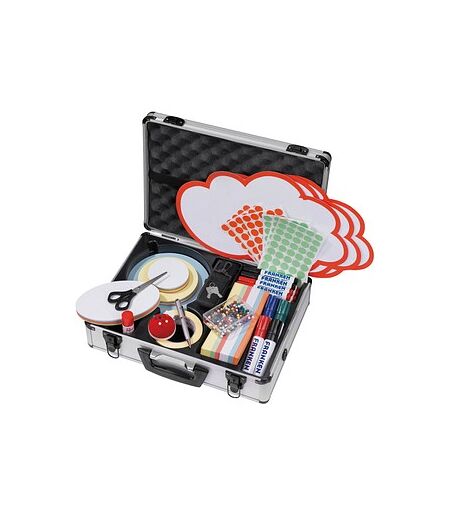 Top ausgerüstet für die ModerationInteraktives Arbeiten ist heute gefragter denn je. Lockern Sie Workshops, Seminare, Vorträge oder Besprechungen mithilfe eines Moderationskoffers auf! Denn was visualisiert wird, bleibt besser hängen. Mit dem Moderationskoffer KOMPAKT von FRANKEN sind Sie bestens ausgestattet. Über 2.000 TeileDer silberne Moderationskoffer mit den Maßen 43,0 x 32,0 x 12,0 cm (BxTxH) ist recht handlich. Dennoch beinhaltet er 2.220 Teile. Nehmen Sie Ihr Publikum mit und machen Sie etwas Action an der Moderationswand. Im Koffer befindet sich umfangreiches Zubehör wie Flipchart-Marker, Schere, Kreppband, Klebestift, Pinnnadeln, Markierungspunkte und Laserpointer mit integriertem Kugelschreiber. Originell sind neben den Papierrechtecken die Moderationswolken, auf denen Schlagwörter gesammelt werden können. Kompakt und mobilMit dem Moderationskoffer KOMPAKT können Sie sich über einen kleinen, aber feinen Begleiter freuen, der mit einigen Schätzen aufwartet. Vollgefüllt mit Material wiegt der Aluminium-Koffer 5,0 kg. Eine angenehme Alternative zum Tragegriff bietet beim Transport der im Lieferumfang enthaltene Schultergurt. Der kompakte Koffer eignet sich auch perfekt zum Deponieren in Besprechungszimmern – so kann er spontan bei Meetings zum Einsatz kommen. Sie wollen garantiert keine Langeweile aufkommen lassen? Dann bestellen Sie noch heute den Moderationskoffer KOMPAKT von FRANKEN direkt hier in unserem Online-Shop. ...