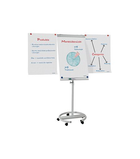 So macht Moderation Spaß! – das FRANKEN Flipchart ECO MobilDas spontane und schnelle Vorstellen einer Idee oder eines komplizierten Inhalts ist mit dem FRANKEN Flipchart ECO Mobil kein Problem. Es lässt sich einfach an einen Wunschort transportieren und ist allzeit bereit. Sie können nicht nur Inhalte visualisieren, sondern auch Ihr Publikum leicht in Ihren Vortrag einbinden.Ganz schön praktischMit trocken abwischbaren Boardmarkern können Sie das FRANKEN Flipchart ECO Mobil beschriften. Worte bleiben bekanntlich besser im Gedächtnis, wenn sie aufgeschrieben werden. Aufbewahren können Sie Ihre Schreibutensilien und das benötigte Zubehör auf der extra dafür vorgesehenen Ablage. Dies hat den Vorteil, dass Sie jederzeit alles aus der Hand legen und weiter frei präsentieren können.Weitere InformationenAuch diese Merkmale sind wissenswert:Wandmaße: 68,0 x 105,0 cm (BxH)Standfläche: 63,0 x 63,0 cmFarbe: lichtgrauGewicht: 15,5 kgDie Höhe lässt sich verstellenDie Höhe des FRANKEN Flipcharts ECO Mobil kann stufenlos in der Höhe zwischen 180,0 - 220,0 cm verstellt werden. Somit können alle Nutzer gleichermaßen gut mit dem Präsentationshelfer arbeiten.Mobil und flexibel!Mit dem FRANKEN Flipchart ECO Mobil sind Sie sehr flexibel. Sie können das Modell in jeden Raum rollen, in dem Sie es gerade benötigen. Die Nutzung ist also räumlich ungebunden und die Schreibwand kann für unterschiedliche Einsatzzwecke verwendet werden. Die feststellbaren Rollen halten Ihre Schreibwand an gewünschter Position und ein unkontrolliertes Davonrollen wird so erfolgreich verhindert.Stabiler Rahmen aus MetallDie Oberfläche aus lackiertem Stahl sorgt bei diesem Produkt für eine ausgezeichnete Ästhetik und Funktionalität. Das Ganze wird durch ein stabiles Metall-Gestell ergänzt. Das Modell ist magnethaftend, beschreibbar. Somit bieten sich Ihnen unterschiedliche Einsatzmöglichkeiten. Auf der einen Seite können Sie wichtige Informationen anbringen und auf der anderen Seite direkt Notizen auf der Oberfläche hinterlassen. So haben Sie Termine, Fristen und Aufgaben stets im Blick. Dank der 2 Seitenarme können Sie Ihre Präsentionsfläche ganz unkompliziert erweitern – somit fehlt Ihnen kein wichtiger Platz mehr!. Hier können Sie weitere Blätter anbringen und somit mehr Inhalte gleichzeitig präsentieren.Das hält!Damit Sie weitere Materialien wie z.B. Pläne oder Fotos präsentieren können, ist die Präsentationsfläche magnethaftend. Der praktische Blockhalter hält nicht nur den dafür gedachten Schreibblock fest, es lassen sich auch großformatige Plakate oder unhandliche Pläne daran befestigen.Passt dieses Modell zu Ihren Bedürfnissen?Durch 3 Jahre Garantie bietet Ihnen der Hersteller bei Bestellung einen zusätzlichen Schutz. Perfekt, wenn Ihnen eine Absicherung wichtig ist. Sie können das FRANKEN Flipchart ECO Mobil bequem in unserem Online-Shop bestellen. ...