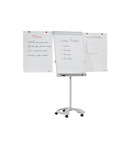 Das Hilfsmittel für Meetings, Seminare oder Workshops – das FRANKEN Flipchart PRO Deluxe MobilDank des FRANKEN Flipcharts PRO Deluxe MobilSie sind unabhängig von Internet, Strom und jeglicher Technik. Profitieren auch Sie von den Vorteilen: Während der Präsentation können Sie die Zuschauenden aktiv einbinden. Das sorgt für eine gute Arbeitsatmosphäre! Außerdem kann Geschriebenes dauerhaft sichtbar gemacht werden, indem Sie die einzelnen Blätter an die Wände hängen.Extra viel PräsentationsflächeDas stabile Gestell aus Metall/Kunststoff sorgt für einen stabilen Stand. Die magnethaftende, beschreibbare Oberfläche besteht aus lackiertem Stahl. Somit bieten sich Ihnen unterschiedliche Nutzungsmöglichkeiten. Sie können nicht nur Dokumente, Bilder etc. unkompliziert anbringen, sondern auch direkt Notizen darauf hinterlassen. So haben Sie Termine, Fristen und Aufgaben stets im Blick. Schon beschriebene Blätter oder weitere ergänzende Inhalte können Sie an den 2 Seitenarmen aufhängen. Dadurch lassen sich komplexe Zusammenhänge verständlich und übersichtlich darstellen.Das ist besonders am FRANKEN Flipchart PRO Deluxe MobilAuf dieses Feature sollten Sie achten: Glasfaserverstärkter Kunststofffuß.Weitere wichtige DatenWeitere Merkmale des FRANKEN Flipcharts PRO Deluxe Mobil:Wandmaße: 67,0 x 95,0 cm (BxH)Standfläche: 57,5 x 62,5 cmFarbe: lichtgrauGewicht: 10,0 kgDie Höhe können Sie flexibel verstellenSie können die Höhe des FRANKEN Flipcharts PRO Deluxe Mobil stufenlos zwischen 180,0 - 195,0 cm verstellen. Hierdurch gestaltet sich die Arbeit mit dem Modell besonders flexibel und bequem.Ganz schön praktischDas Modell können Sie nach Belieben beschreiben. Somit können Sie Ihre Themen veranschaulichen und festhalten. Um das FRANKEN Flipchart PRO Deluxe Mobil nicht unabsichtlich zu beschädigen, sollten Sie generell zu trocken abwischbaren Boardmarkern greifen. Die clevere Markerablage an der Unterkante dieses Modells ist ganz besonders praktisch, denn man hat das nötige Schreibutensil immer gleich griffbereit.Hier wird alles festgehalten!Die Präsentationsfläche ist magnethaftend, das heißt, wichtige Dokumente und Notizen können einfach befestigt werden und sind so jederzeit sicht- und einsetzbar. Falls Sie nicht auf der Oberfläche, sondern auf Blättern schreiben möchten, dann können Sie diese problemlos im Blockhalter befestigen. Hier können auch weitere Dokumente wie z.B. Plakate oder Pläne Ihren Platz finden.Ermöglicht eine flexible NutzungIhr neuer Helfer verfügt über Rollen, was die Nutzung ganz besonders flexibel macht. Sie können dieses Modell immer so ausrichten, wie Sie es gerade benötigen. Damit die Schreibwand während eines Vortrags an gewünschter Position bleibt und nicht unkontrolliert davonrollt, lassen sich die Rollen ganz einfach blockieren.Konnte dieses Modell Sie überzeugen?Ein zusätzlicher Schutz wird Ihnen durch 3 Jahre Garantie des Herstellers geboten. Bestellen Sie das FRANKEN Flipchart PRO Deluxe Mobil doch einfach hier bei uns online! ...