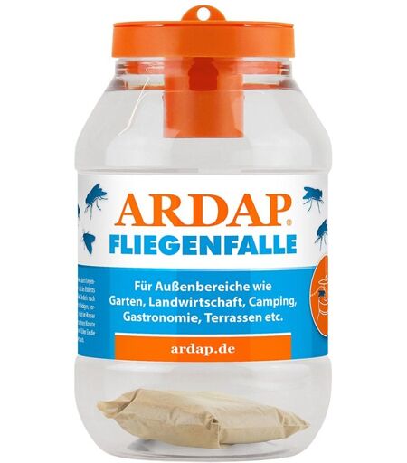 Anwendungsgebiet von Ardap Fliegenfalle OutdoorMit der Ardap Fliegenfalle Outdoor werden Fliegen schnell und einfach gefangen. Der spezielle Köderstoff lockt die Fliegen in das Innere des Behälters. Durch die speziellen Einflugöffnungen können sie daraus nicht mehr entkommen. Verhindert die Anlockung von Nützlingen.Wirkstoffe / Inhaltsstoffe / ZutatenArdap Fliegenfalle Outdoor enthält: 0,01 g/kg GeraniolDosierungAnwendungsempfehlung von Ardap Fliegenfalle Outdoor:Befüllen: Füllen Sie die Falle mit warmem Wasser (mind. 20 °C) bis zum oberen Rand des Etiketts. Der enthaltene, wasserlösliche Köderbeutel bleibt im Inneren.Köder aktivieren: Der Beutel löst sich im Wasser auf, der Lockstoff entfaltet seine Wirkung innerhalb von 2–3 Tagen.Platzieren: Ziehen Sie den Deckel nach oben und stellen oder hängen Sie die Falle an einem sonnigen, warmen Ort auf – dies unterstützt die optimale Wassertemperatur.Langzeitwirkung: Der Lockstoff bleibt über mehrere Monate aktiv.Wasserstand prüfen: Kontrollieren Sie regelmäßig den Wasserstand und füllen Sie bei Bedarf bis zur Markierung nach.HinweiseFalle trocken lagern. Darf nicht in die Hände von Kindern gelangen. Die Falle kann im Hausmüll entsorgt werden.Biozidprodukte vorsichtig verwenden. Vor Gebrauch stets Etikett und Produktinformationen lesen.Ardap Fliegenfalle Outdoor können in Ihrer Versandapotheke www.apotheke.at erworben werden. ...
