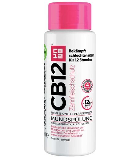 Anwendungsgebiet von Cb12 Mundspülung ZahnfleischschutzEntdecken Sie die Cb12 Mundspülung Zahnfleischschutz mit einer einzigartigen, patentierten Formel, die speziell entwickelt wurde, um Ihr Zahnfleisch zu schützen und zu pflegen. Die innovative Kombination aus Xylitol und Galacto-Oligosacchariden (GOS) bietet umfassenden Schutz für Ihre Mundgesundheit. Durch die Reduzierung von Plaquebildung und die Unterstützung einer gesunden Mundflora wirkt diese Mundspülung effektiv gegen schädlichen Biofilm.Cb12 Mundspülung Zahnfleischschutz bekämpft nicht nur Mundgeruch, sondern auch dessen Ursachen und sorgt so für langanhaltend frischen Atem bis zu 12 Stunden. Die alkoholfreie, sanfte Formel ist klinisch geprüft und zeigt eine hohe Wirksamkeit bei der Reduzierung von Zahnfleischentzündungen und Zahnfleischrückgang. Cb12 Mundspülung Zahnfleischschutz ist geeignet für Erwachsene und Kinder ab 12 Jahren und schmeckt nach Minze.Wirkungsweise von Cb12 Mundspülung ZahnfleischschutzRegelmäßiges Spülen mit Cb12 Mundspülung Zahnfleischschutz führt zu einer Verschiebung der mikrobiellen Zusammensetzung hin zu einer gesünderen Mundflora und reduziert die Entzündungsneigung der Mundschleimhaut.Wirkstoffe / Inhaltsstoffe / ZutatenInhaltsstoffe von Cb12 Mundspülung Zahnfleischschutz:Aqua, Glycerin, Hydrogenated Starch Hydrolysate, Peg-40 Hydrogenated Castor Oil, Xylitol, Zinc Acetate, Sodium Fluoride, Chlorhexidine Diacetate, Galactooligosaccharides, Aroma, Arginine, Citric Acid, Potassium Acesulfame, Lactose, Galactose, Glucose, Menthol, Mentha piperita oil.GegenanzeigenBei bekannter Überempfindlichkeit gegenüber einem der Inhaltsstoffe sollte das Produkt nicht verwendet werden.DosierungAnwendungsempfehlung von Cb12 Mundspülung Zahnfleischschutz:Die Mundspüllösung kann 2 x täglich ab einem Alter von 12 Jahren angewendet werden. Nach dem Zähneputzen 30 bis 60 Sekunden lang mit 10 ml spülen, gurgeln und dann ausspucken. Verwenden Sie dazu den Deckel, füll ...