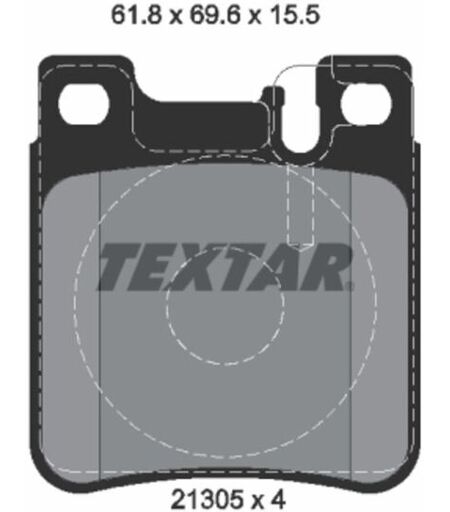 Breite [mm]: 61,8. Bremssystem: Teves. Dicke [mm]: 15,5. Hersteller: TEXTAR. Herstellernummer: 2130501. Höhe [mm]: 69,6. Index: 2130501. Montage Achse: Hinten. Produktart: Bremsbelagsatz. Vorbereitung für Verschleißkontakt: Ja. WVA-Nummer: 21305. ...