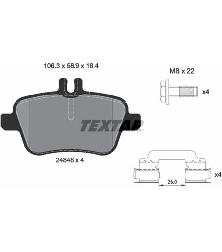 Breite [mm]: 106,3. Bremssystem: TRW. Dicke [mm]: 18,4. Hersteller: TEXTAR. Herstellernummer: 2484805. Höhe [mm]: 58,9. Index: 2484805. Montage Achse: Hinten. Produktart: Bremsbelagsatz. Verschleißkontakt: Ja. Vorbereitung für Verschleißkontakt: Nein. WVA-Nummer: 24848. ...