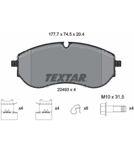 Anzahl der Beläge: 4. Anzahl der schrauben: 4. Breite [mm]: 177,7. Bremssystem: CBI. Dicke [mm]: 20,4. Hersteller: TEXTAR. Herstellernummer: 2249301. Höhe [mm]: 74,5. Index: 2249301. Material: Low-Metallic. Montage Achse: Vorne. Produktart: Bremsbelagsatz. Typprüfung: ECE R90 APPROVED. Vorbereitung für Verschleißkontakt: Ja. WVA-Nummer: 22493. ...