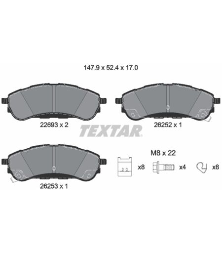 Breite [mm]: 147,9. Dicke [mm]: 17. Hersteller: TEXTAR. Herstellernummer: 2269301. Höhe [mm]: 52,4. Index: 2269301. Montage Achse: Hinten. Produktart: Bremsbelagsatz. Verschleißkontakt: Ja. WVA-Nummer: 22693. verschleisskontakttyp: akustisch. ...