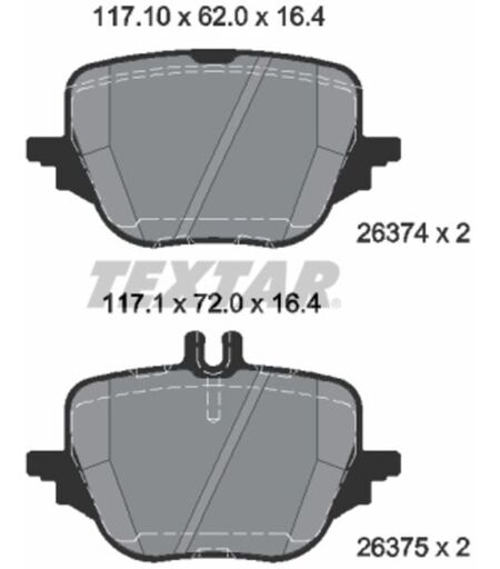 Breite [mm]: 117,1. Bremssystem: ZF. Dicke [mm]: 16,4. Für bremsscheibendurchmesser [mm]: 320. Hersteller: TEXTAR. Herstellernummer: 2637401. Höhe [mm]: 62, 72. Index: 2637401. Material: Low-Metallic. Montage Achse: Hinten. Produktart: Bremsbelagsatz. Typprüfung: E9 90R-02A0841/5700. Vorbereitung für Verschleißkontakt: Ja. WVA-Nummer: 26374. ...