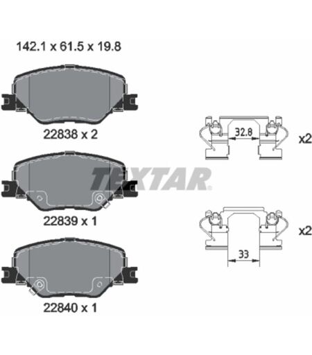 Breite [mm]: 142,1. Bremssystem: Akebono. Dicke [mm]: 19,8. Hersteller: TEXTAR. Herstellernummer: 2283801. Höhe [mm]: 61.5. Index: 2283801. Montage Achse: Vorne. Produktart: Bremsbelagsatz. Verschleißkontakt: Ja. WVA-Nummer: 22838. verschleisskontakttyp: akustisch. ...