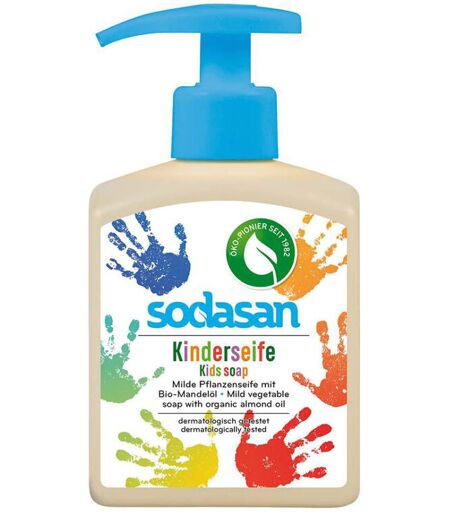 Bunte Flasche mit kindgerechtem Spender: Die flüssige Seife in der standsicheren Flasche ist perfekt für Kinderhände! Die bio-zertifizierte Pflanzenseife ist besonders mild, duftet angenehm und sorgt für ein weiches Hautgefühl. Hergestellt wird die Flüssigseife in einem schonenden Siedeverfahren mit Bio-Olivenöl und Bio-Mandelöl. Das Produkt ist frei von synthetischen Farb-, Konservierungs- und Duftstoffen. Inhalt 300 ml. ...