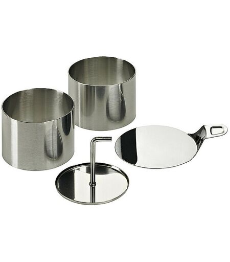 Set bestehend aus sechs Ringen, Stampfer und Tablett Komplett aus rostfreiem Edelstahl Größe der Ringe: Ø 7,5cm, Höhe 5,5cm Spülmaschinengeeignet ...