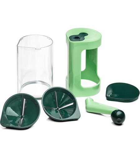 Mit dem Spiralschneider „Super Julietti“ müssen gesunde Ernährung und Abnehmen nicht länger langweilig sein: Verwandeln Sie Obst und Gemüse in dekorative Spiralen und feine Juliettis – für frische Salate, Pfannengerichte und vieles mehr! Dank der extra scharfen Klingen schneiden Sie alle Zutaten in Sekundenschnelle spielend leicht – auch kleinste Zutaten oder größere Mengen. Alles landet direkt im Auffangbehälter und kann mit dem Frischhaltedeckel verschlossen werden – für ein sauberes Arbeiten. Mit ergonomischer Kurbel, 2 Schneid-Einsätzen und Auffangbehälter (Füllmenge: 900 ml) mit Frischhaltedeckel. Set-Inhalt: Hauptteil, Kurbel, Schneideinsatz mit glatter Klinge, Schneideinsatz mit Julietti-Klinge, Auffangbehälter (Fassungsvermögen: 900 ml), Frischhaltedeckel ...